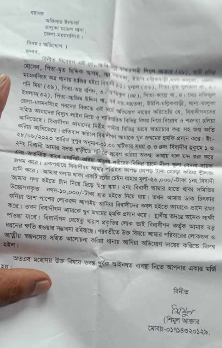 ভালুকা মডেল থানার ওসি শাহ মোঃ কামাল আকন্দ জানান, লিখিত অভিযোগ পেয়েছি, তদন্ত করে প্রয়োজনীয় ব্যবস্থা গ্রহণ করা হবে।